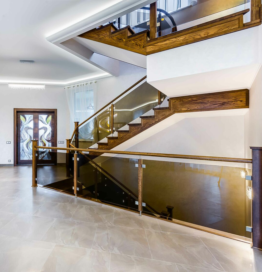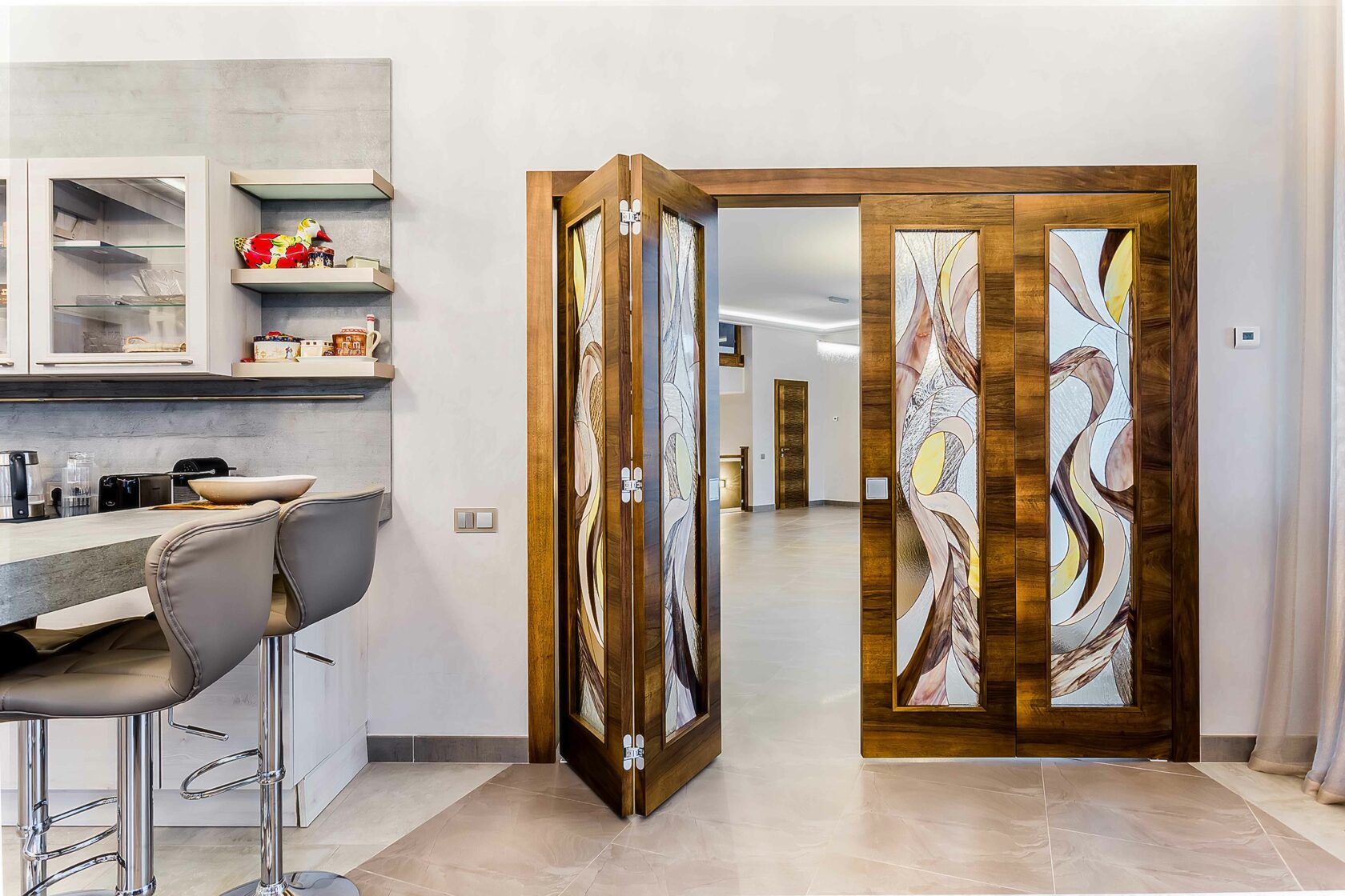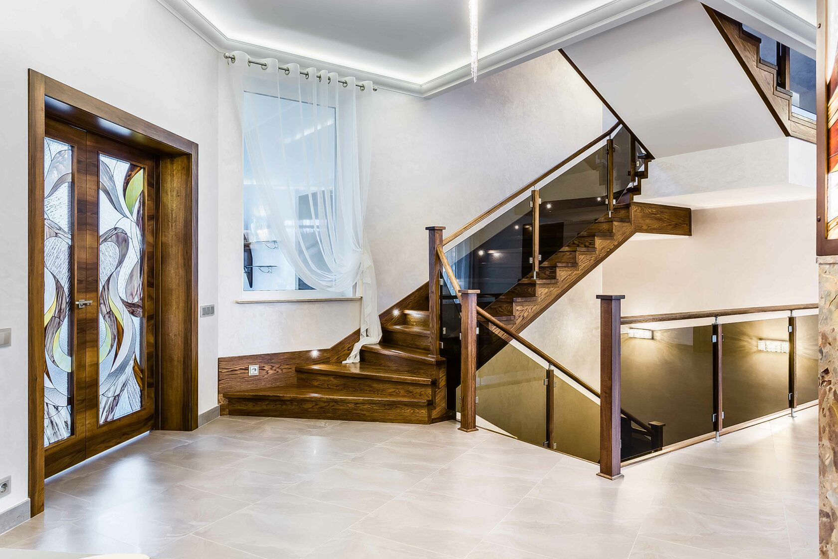Для этого проекта мы изготовили двери разных форматов — от глухих классических до раздвижных. В некоторых использовали витражи Тиффани из дизайнерского стекла, рисунок которых разрабатывали вместе с заказчиком.