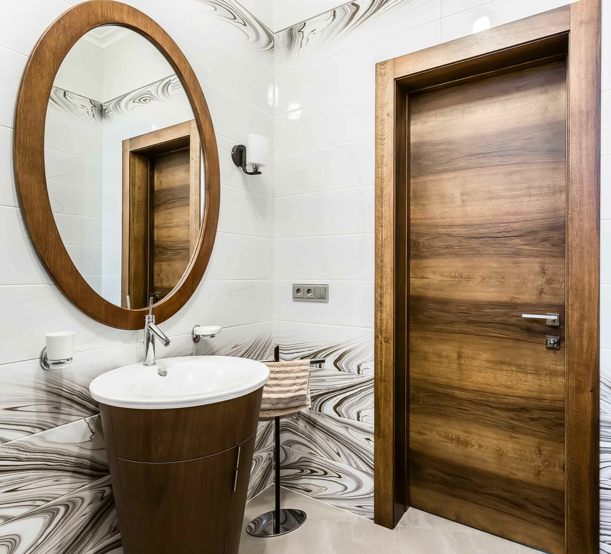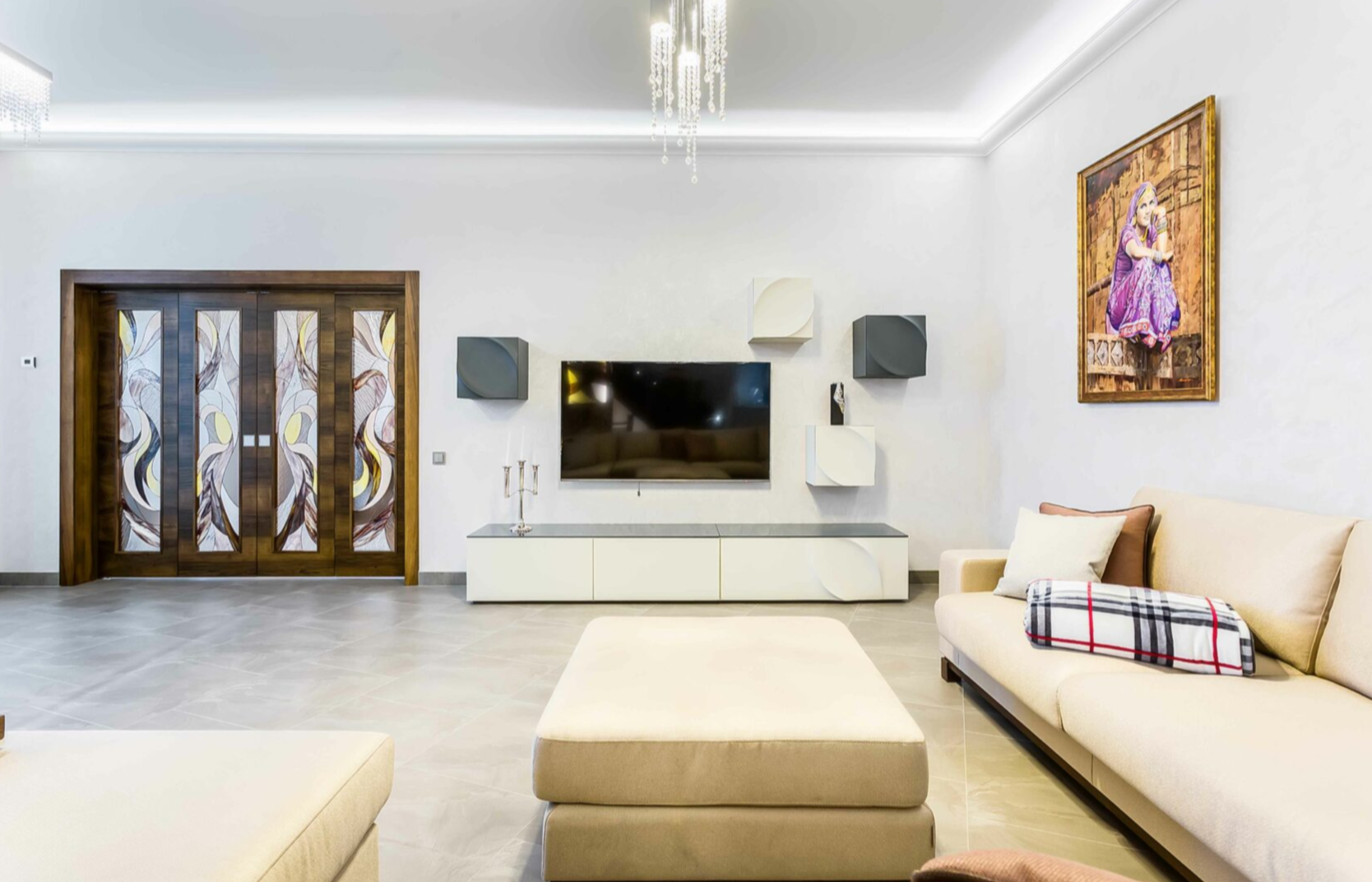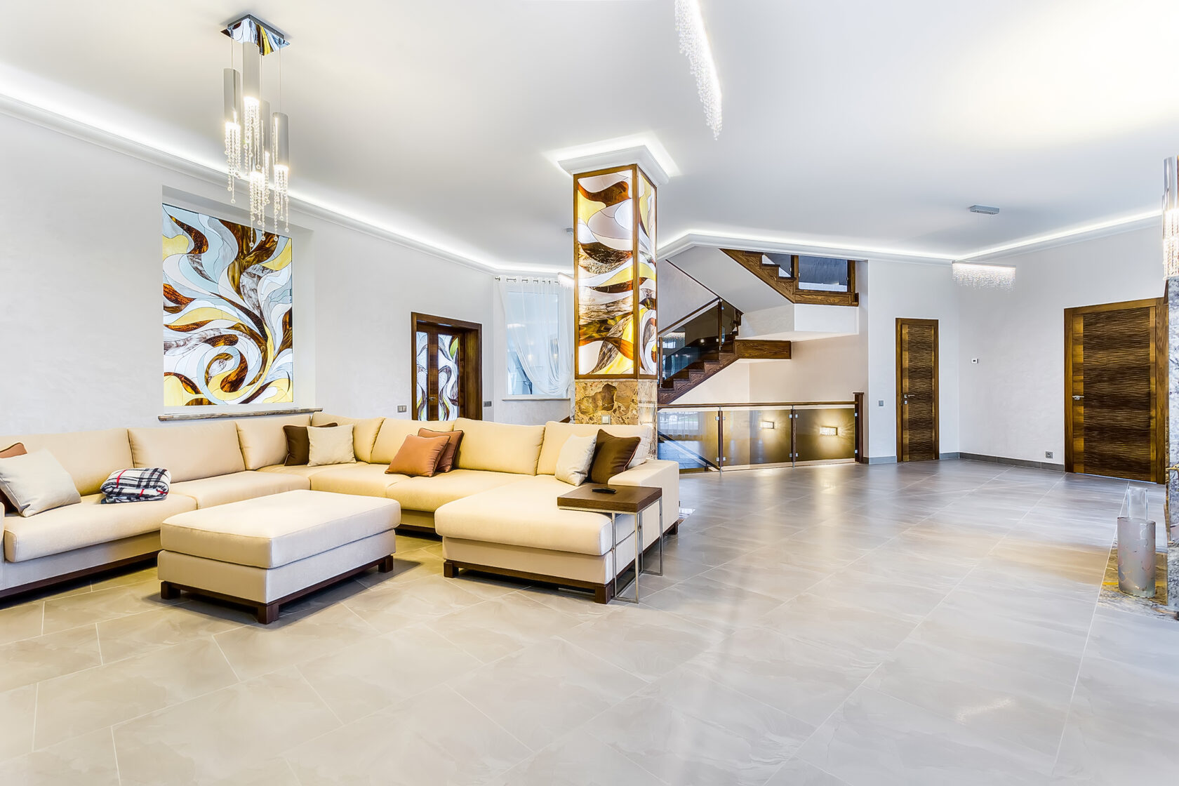 Для этого проекта мы изготовили двери разных форматов — от глухих классических до раздвижных. В некоторых использовали витражи Тиффани из дизайнерского стекла, рисунок которых разрабатывали вместе с заказчиком.