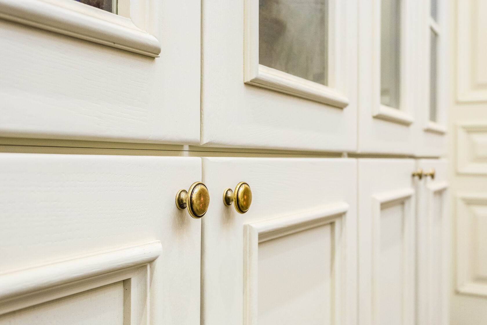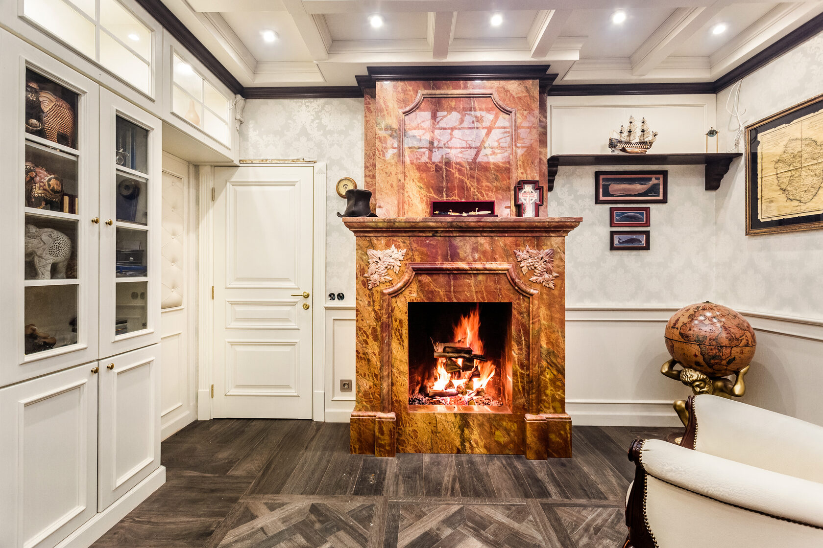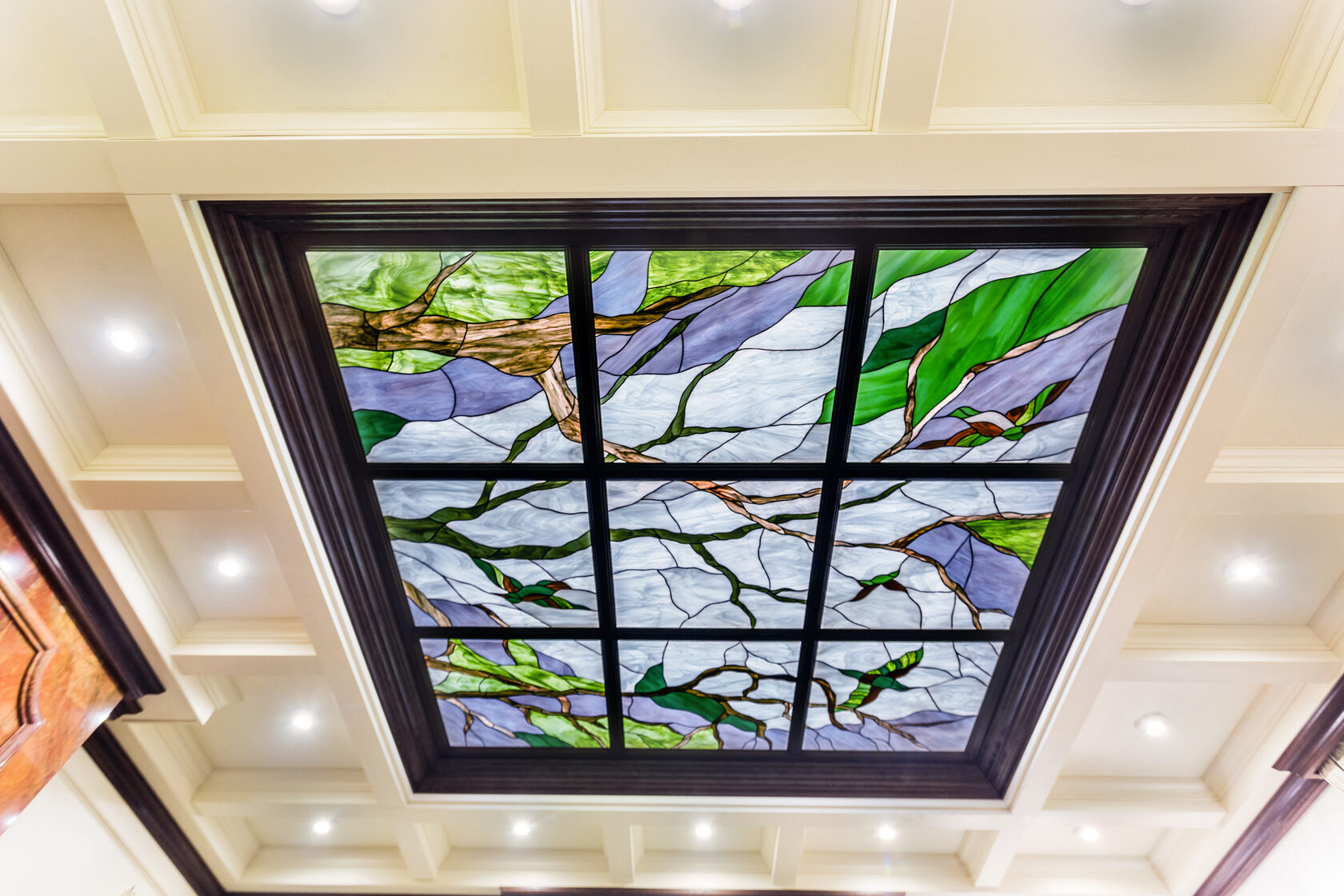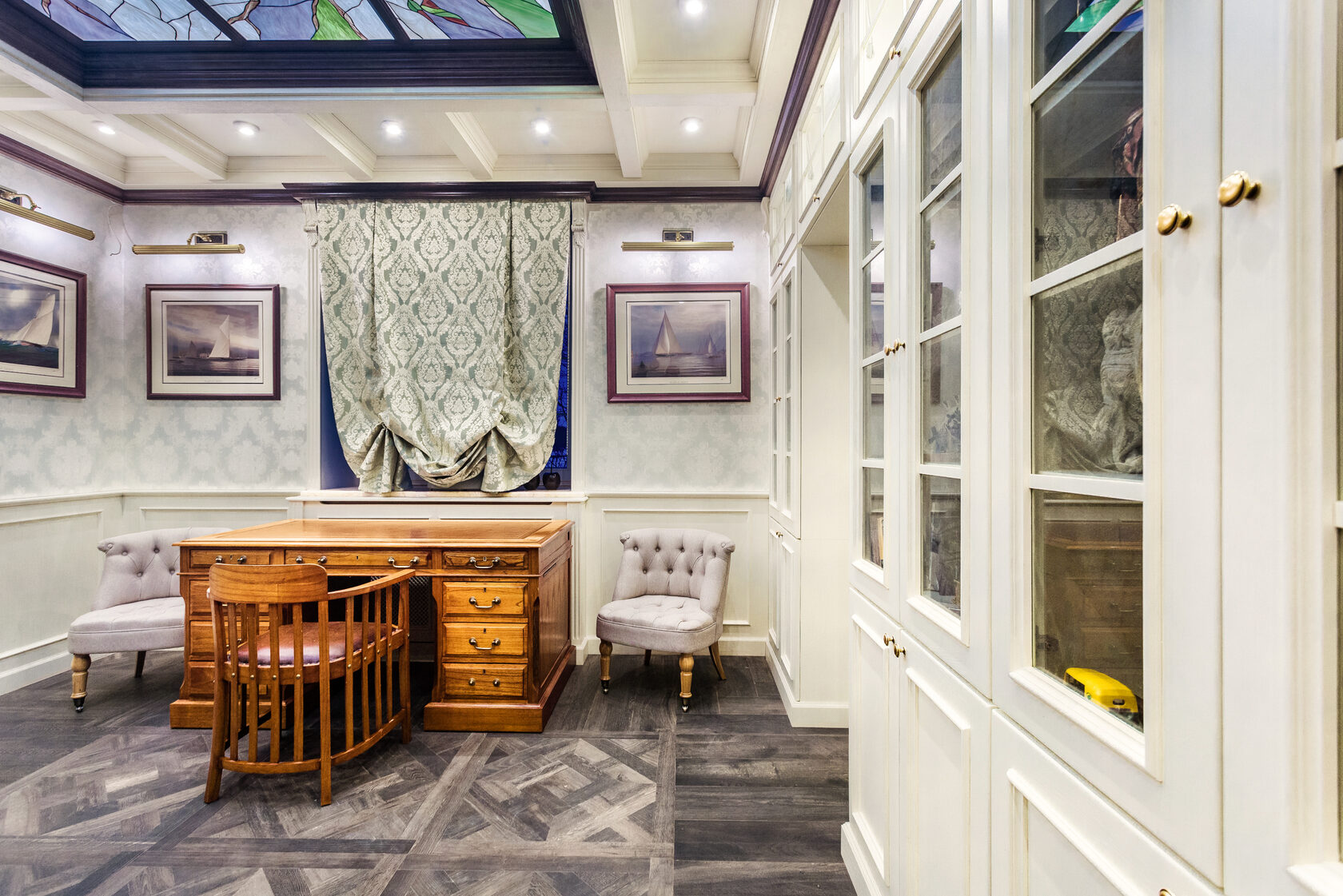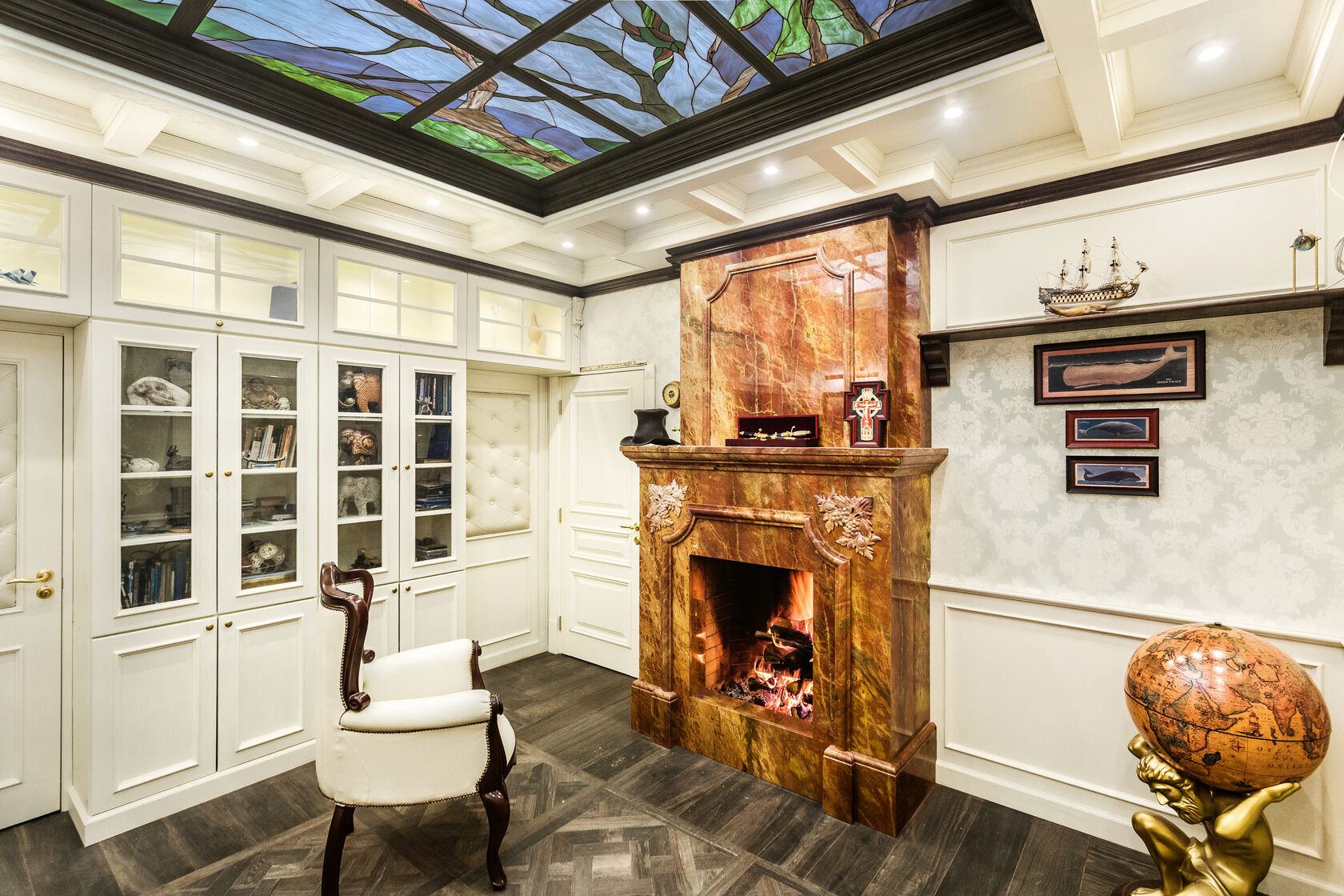 Классический кабинет в белом стиле с витражом в потолке. Кессоны, библиотека и стеновые панели. Кресло ручной работы изготовлено специально по просьбе заказчика.